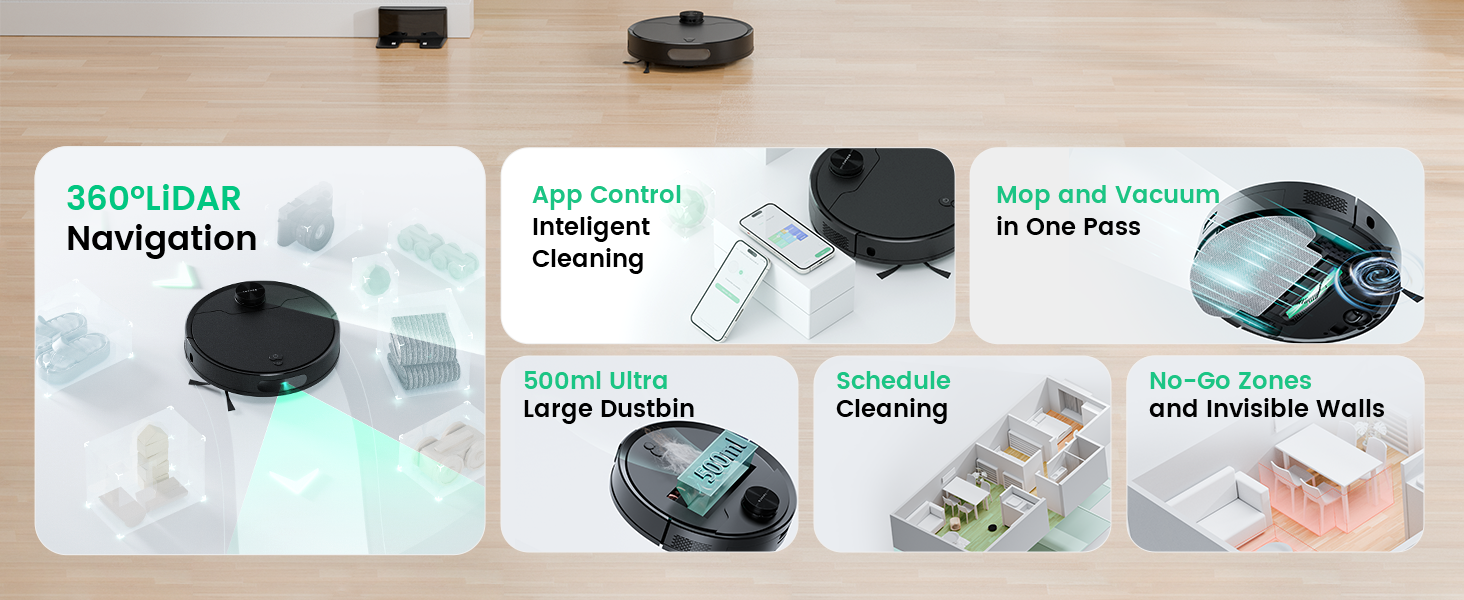 The Tuvacs T10 SE household vacuum cleaner features advanced 360° lidar navigation for precise multi-floor mapping and efficient Z-shaped cleaning. Equipped with AI-powered obstacle avoidance, the Tuvacs T10 SE robot vacuum sweeper ensures smooth and uninterrupted cleaning. With an easy setup and intelligent app control, this vacuum cleaner for deep cleaning offers complete control from your smartphone. Powered by a 5000mAh battery, the Tuvacs T10 SE smart robotic vacuum delivers up to 180 minutes of consistent cleaning, making it the perfect household vacuum cleaner. Whether you're looking for a remote-controlled vacuum cleaner or a reliable household vacuum cleaner, the Tuvacs T10 SE smart robotic vacuum provides all-in-one convenience for a spotless home.
